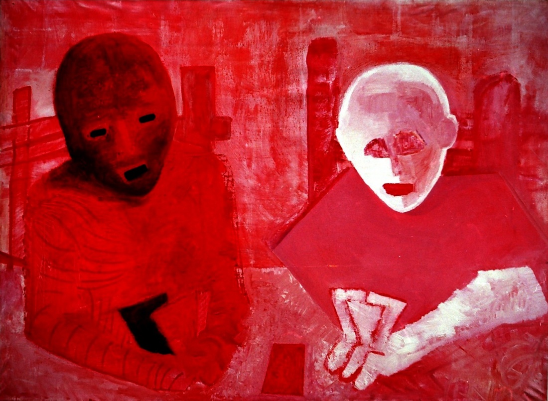 Skojarzenie? Po tego po prawej przyszłą śmierć. I grają o jego życie w karty. Pokój jest spowity czerwienią wschodzącego słońca, facet -co zrozumiałe- blady jak ściana. Wytrzeszczył oczy i otworzył usta bo mu karta nie idzie :))))