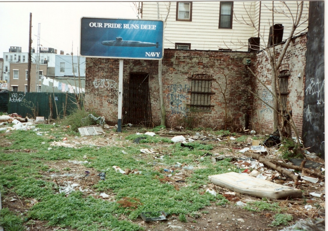 Zachęcająca do wstępowanie do marynarki wojennej tablica z napisem "Nasza duma jest głęboka - marynarka wojenna" w polskiej dzielnicy Greenpoint w Nowym Jorku w latach 90-ych