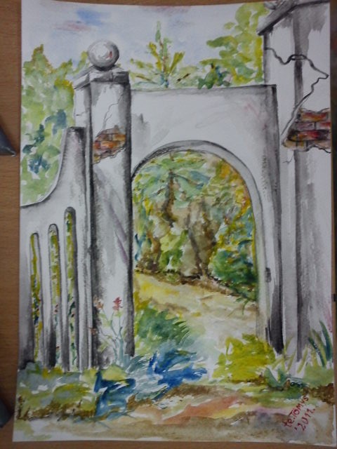 Akwarela - wjazd do pałacu w okolicach Kalisza