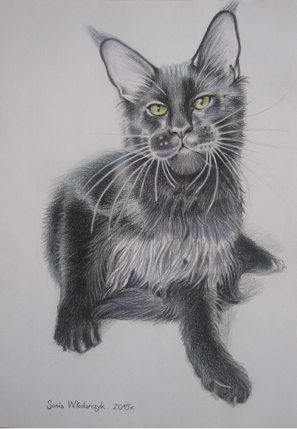 Rysunek kredkami, format A4. Poza dosyć wyszukana, ale to na życzenie właścicielki. Poza tym Lukas niechętnie chyba pozuje na siedzącą. Na wszystkich innych zdjęciach widziałam go leżącego :)