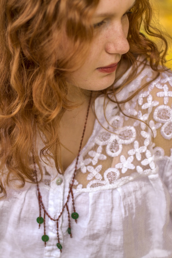Miedziany naszyjnik, którego nie widać, bo ostrość łapie twarz Kasi :)
