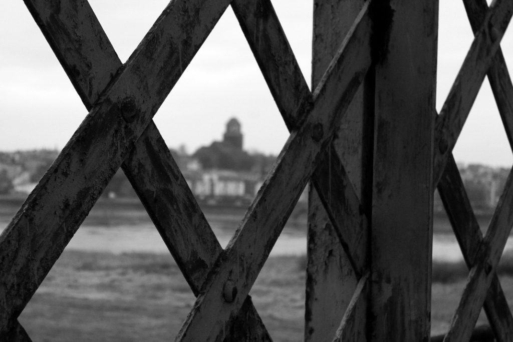 Widok na kościół pod wezwaniem Św. Piotra w Tczewie na Starym Mieście przez kratownicę na moście (18 marzec 2014)
