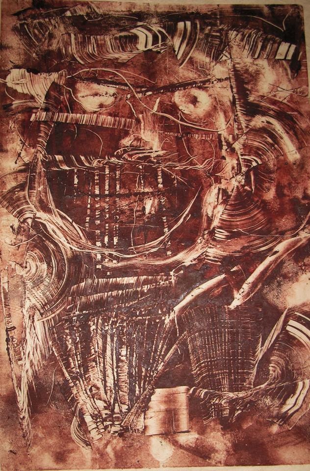 Monotype, printed from an aluminum plate with DS Burnt Umber etching ink on Rives BFK printmaking paper