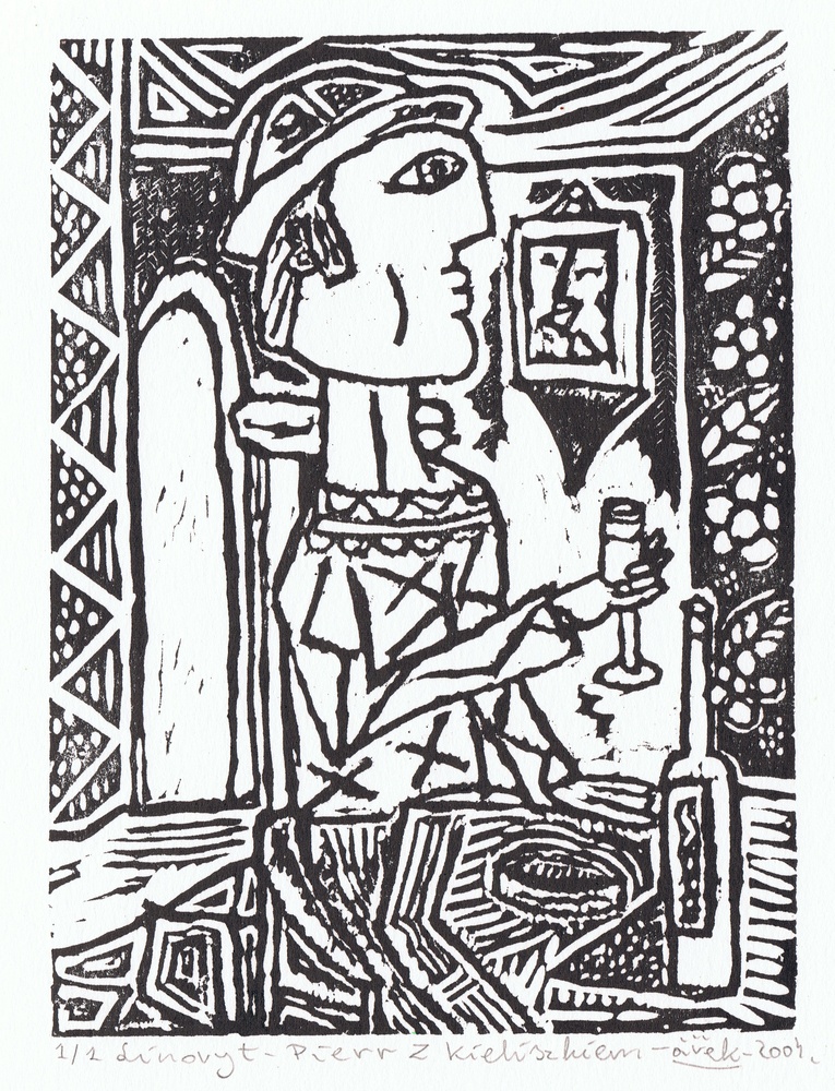 Pierr z kieliszkiem. 11,8 x 16 cm. 2004 r. (linoryt)