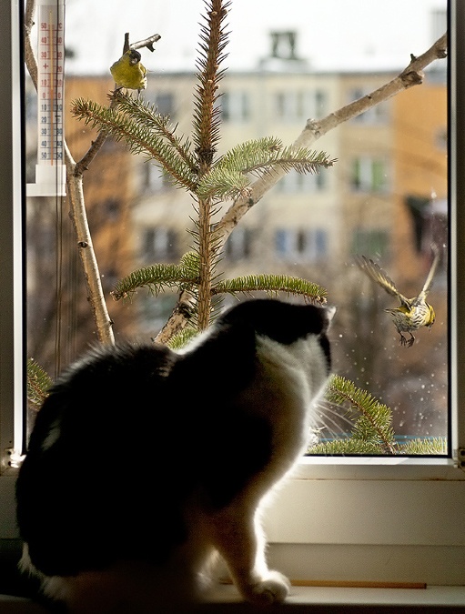 nasza Lucia jest bystra za szybą,gdy bym otworzył balkon to pewnie pierwsza by uciekła ptaki ją ignorują ,ale ona ma zajecie na cały dzień