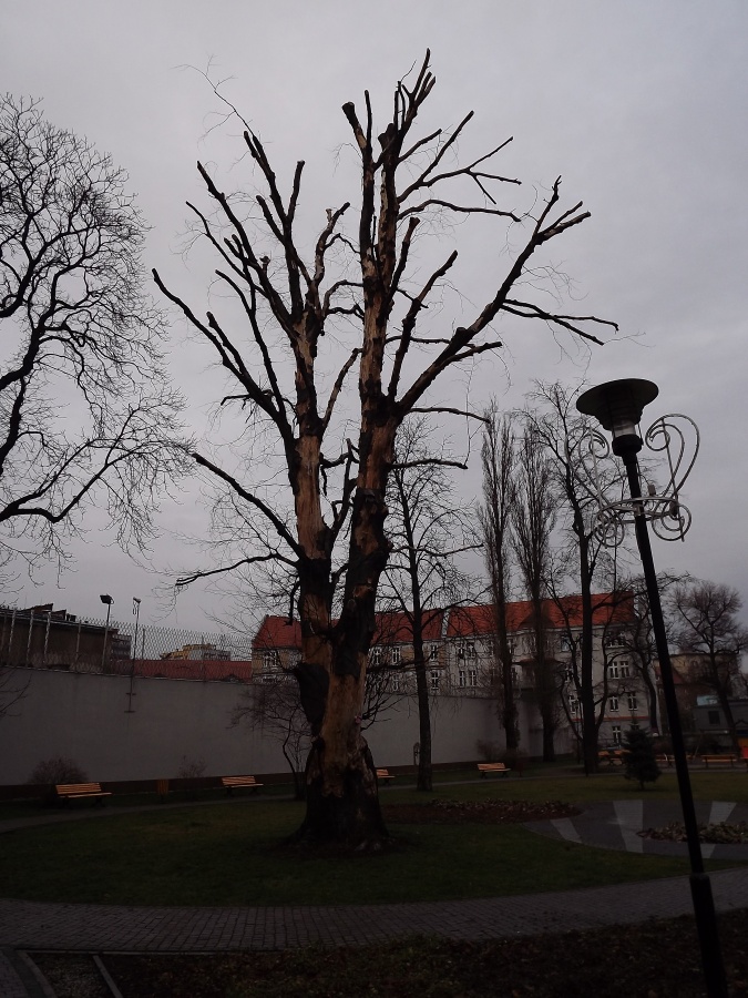 hmm, wycięłabym/ominęłąbym latarnię, i podeszłabym bardziej od dołu, bo się podstawa drzewa zaciera na tle muru