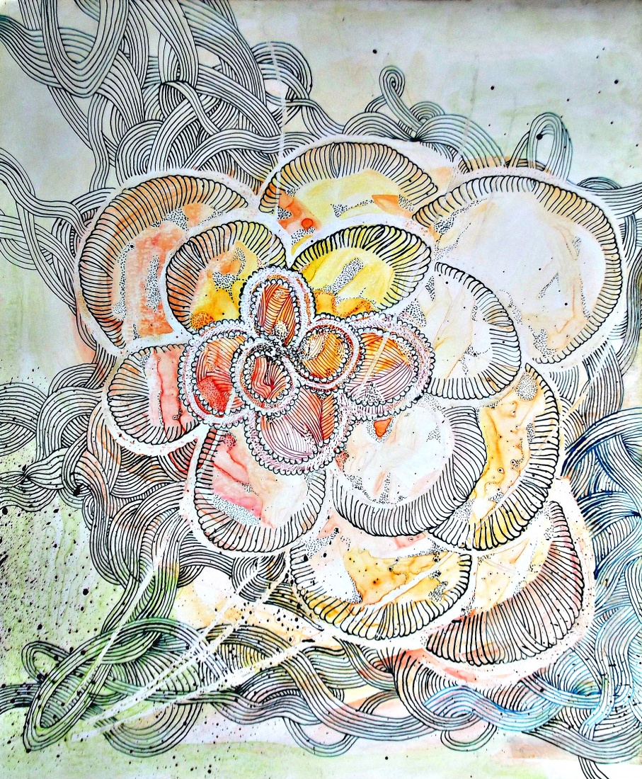 Wachlarz z kwietnych płatków :) Dorotko, pomarszczył mi się papier. Chyba za bardzo go namoczyłam przy tworzeniu akwarelowych plam. Gdy przycisnę szkłem, to jakoś wygląda. Jak myślisz, da się jakoś wyprostować, czy lepiej zostawić ? To papier 160 G na metr kwadratowy. To mazaje :)