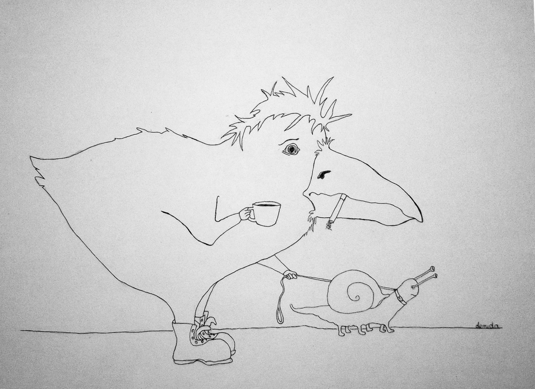 Rysunek filozoficzny: ptak to nasza podświadomość, która jest zaspana, a może i skacowana. Smętna, z fajką i kawą... Ślimak to konieczność pójścia do roboty/ na wykłady, etc. A nam się tak nie chce... To ślimak nas ciągnie, a nie my go wyprowadzamy- to on nas.. dlatego ma nóżki, zamiast jednej obłej nogi- by doprowadzić nas, dowieść do miejsca przeznaczenia, choć najchętniej jeszcze zostalibyśmy w wyrku...