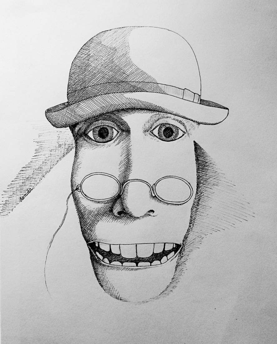 nos trzyma okulary/ krój zębów trendy/ znaczy- nie za stary/ na czubku dla śmiechu, czy na pokutę/ zwieńczeniem maupy skrzy kapelutek:)))