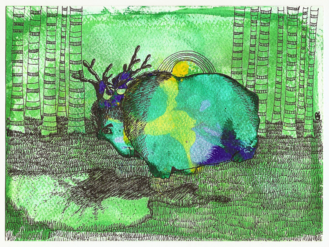 nie siebie pragnął ujrzeć w kałuży przy Księżycu - swoje rogi czy one już zakwitły. Tak jakby bambusowa trawa w tle sobie wyrosła :)