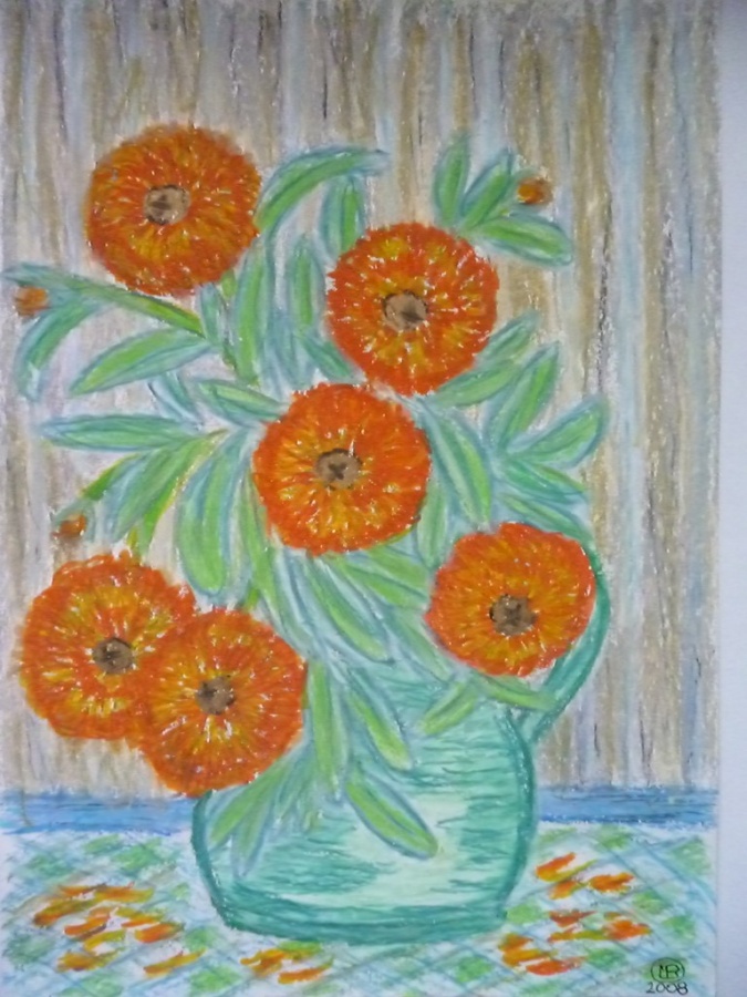 cos tak a la Van Gogh-2008:)wys-29,5cm a szer-21cm:)papier-pastele tluste:)(inspiracja;calosc kompozycja wlasna):)(kwiatki sobie ot tak wymyslilam:)nawet nie wiem czy wogole takie istnieja:))wazon ktory namalowalam niestety sie rozbil a szkoda bo byl sliczny i w pieknym kolorze grube szklo zielonkawo-niebieskie:(no ale zostal jego fragment uwieczniony:)