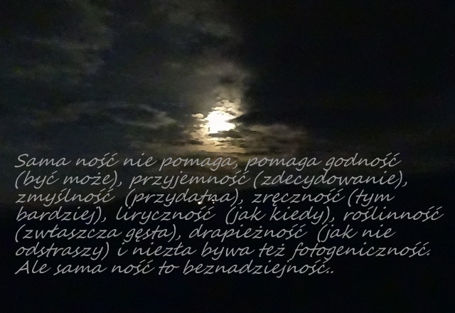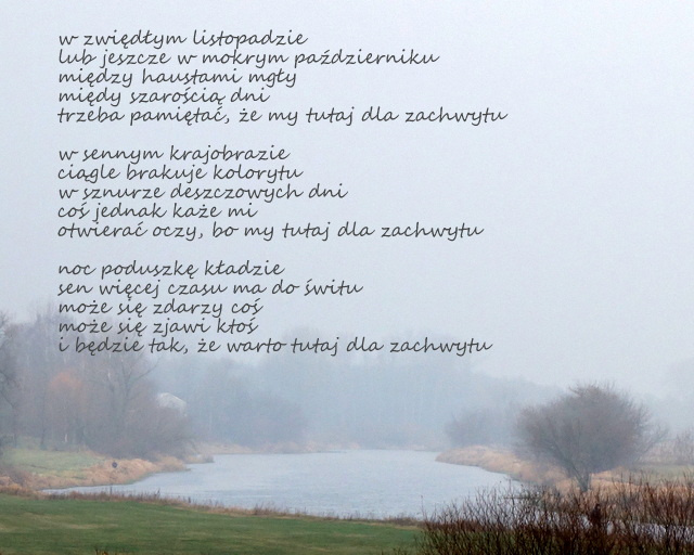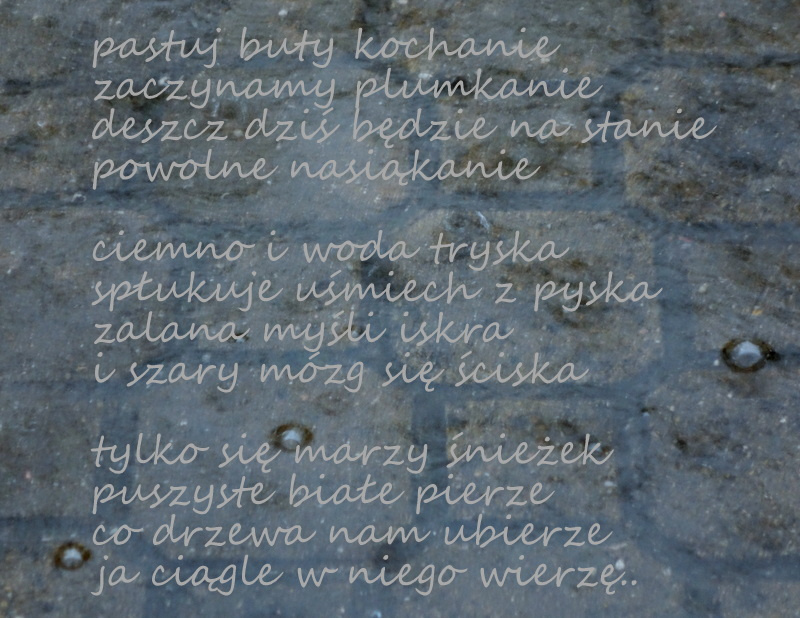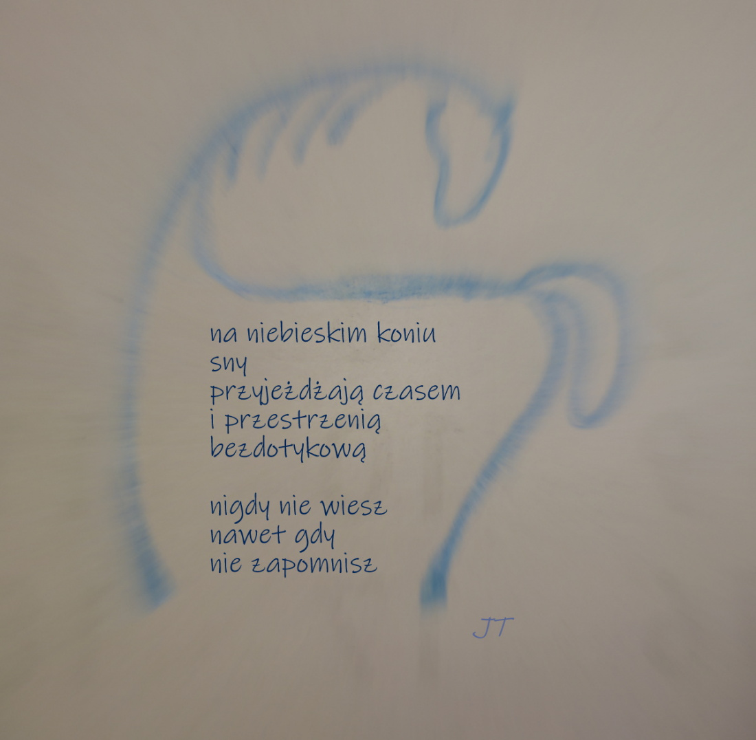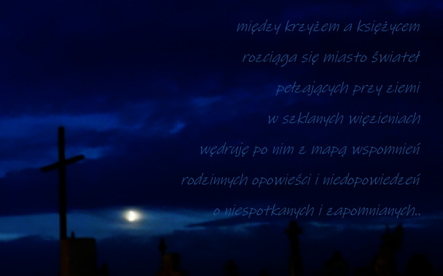 Other postcards: i co że szarość.., czas, sowów trzech, kolor nocy, zapomniana zima, wędrówka, znalezione.., początek zimy, chwila o szóstej, gdzie czas zatarł.., bezsenne noce, sax, pozbędziesz się złudzeń.., wokół twojej miękkiej muzyki, nowe modele lalek, na noc.., złamać.., wciąż nie wiem, jaki to wzór, ale kawałki nie chcą pasować inaczej, miałam ciało, pierniczenie.., eklektyczna forma, rozmoczone, w kręgu ramion, i trochę koloru, obezwłasnowolnienie, carpe.., znów, kosmetyka, nie tylko listopad, słownik, aspekty techniczne, pod przykrywką, koniec dnia, auto bez portretu, kitsch, na palcach, obracam do siebie, nie powiem.., nadal sny, ten czas, niby eko.., bełkoty bezsenne.., wyrzucę cię .. i .., już czas, zachodząc, co robisz w moim ogródku - pytanie wzajemne.., bez lustra (17), skąd..(17), że.., sasanka, bagaż podręczny, czekałam na progu.., na zetknięciu przy skórze, stworzyć historię, nierówno, poczucie jasności i ciemności pełne, zbędność, pies zamyka oczy, bezdech, noc bez snu, w kafkowskim nieoczekiwaniu.., tylko pogłos, nie umieraj, Pinokio, jeszcze jedną noc trwaj.., zaproście go do stołu.., zimno.., tylko poezja wierna.., w przypływie koniec.., właśnie ten wiatr.. na liliowych wrzosowiskach, owdowiałe krople, jeszcze wczoraj po ogrodach.., iść gdziekolwiek.., do menueta., w sylogizmach, do nieznanych.., 2021, boso, strząsnąć popiół, łatwiej mi kochać.., przecież zostaje.., można czasem nie kochać.., bezkształtność traw, a może tak.., smugi cienia na przepalonym księżycu, z kokardami, algorytm, zatrzymać chwilą, myśli apetyczne (1), ostatni dzwonek, zaklęcie, na własne, startując, milczymy, w warstwie dźwiękowej.., szczęścia maluczkich, namalowane przez córkę, tańczą na wietrze, w jabłku, dłonie zajęte, cudze imiona, nocami obserwuję, deszcz.., jeśli.., implikacja, nastał klimat.., wtulona w twoje ramiona.., nie mów, że już zmierzcha.., nie czytać wciąż tych samych.., podkreśla jej nieobecność, przesuwa się jak kot, bez pożegnania, zanim zaczynamy się kochać, niepoznane pocałunki, jest niewymownie, urojone usta, w najciemniejszym kącie raju, iskrówka, w objęciach trzymałam twój cień.., że o niczym innym, nie przekraczać sfery smarowania, ta wiosna, wieczorem powietrze zapachniało, teraz też jest ciemno, jajo wielkanocne, karma.. czy karma?, a może by tak.., deszcz, wiatr i kot Lucek, ciasne, ale własne.. ale ciasne, niezrównany pejzażysta, jakby była ikoną, odlatuje(my), pokój (nam), zejście do konkretu, przymus nie do pokonania, herbu chrrr, teoria względności poezji, a póki co i potem.., "wymłócone" myśli splata w warkocze wierszy, migawka, żar z papierosa, ten sam od lat, jest w tym jakaś pułapka, i tylko ślady stóp utoną.., zawahanie, jeden kieliszek, każda minuta jest, wykiełkuje, poczekalnia, z ręką, pękło, wymażą,