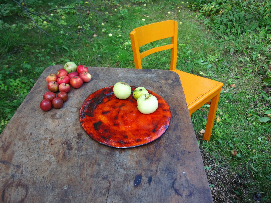 właściwie wszystkie elementy na powyższym obrazku są wytworem ręcznym, zdecydowałam się na wyszczególnienie krzesła aby zwrócić uwagę na jego niepowtarzalny kolor. Akurat zdjęcie oddaje prawidłową barwę. Wlaściwie nigdy, nie spotkałam krzesla pomalowanego na żółty jajeczny. Efekt niesamowity. Dodatek zjedzonych przez warunki atmosferyczne starych sprzętów tworzy cymesik do schrupania na raz. No, i jak ten talerz.