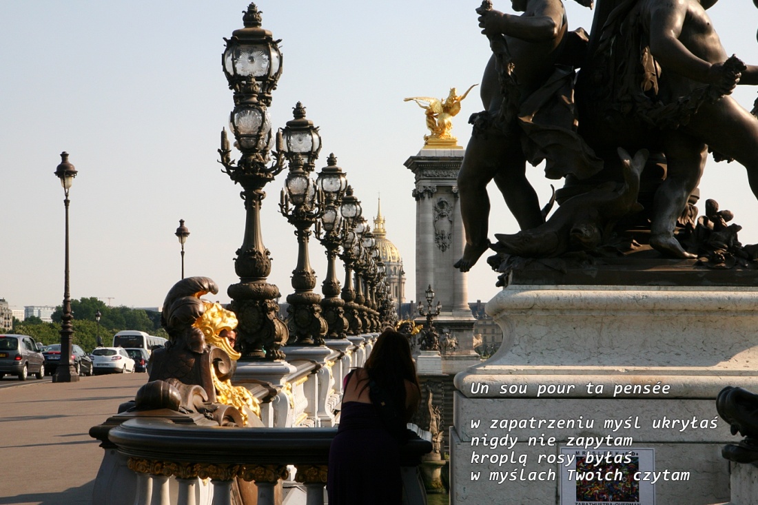 other postcards: il a dit que ..., parfums du jardin - zapachy ogrodu, Panicaut maritime - Mikołajek nadmorski, Respiration - Oddech, non loin de Biscaya - niedaleko od Biscaya, l'univers se tait depuis sa naissance - świat milczy od momentu stworzenia, la courbe aléatoire - krzywa losowa, iris nuancé - tęczówka z podcieniami, un petit cri de la modestie - zew skromności, sans désespoir - bez rozpaczania, tant attendu - tak oczekiwany, une petite flamme - płomyk, Le Grand Éleveur - Wielki Hodowca, s'accrocher au néant - zahaczyć się o przestrzeń, enfuie dans la dune - zawoalowana w wydmie, reveil - przebudzenie, le monde du petit - świat oczami dziecka, et si c’était vrai - gdyby to było prawdą, étreintes de la Lune - w objęciach Księżyca, retour - powrót, Vilanella sans canne - Vilanella bez laski, tes pensées - twoje myśli, la vague - fala, imagination en couleur, le tiroir - szuflada, rose de sable - róża pustyni, les espérances, recto verso, le père - ojciec, ici on danse, événement - wydarzenie, un petit grain de sable - ziarenko piasku, pieds nus - bose nóżki, le tonneau - beczka, papillon de nuit - ćma, la cabane du pêcheur (Francis Cabrel) - chata rybaka, dans mes rêves - w mych snach, le temps noyé - czas zatopiony, extase du dimanche, caverne du philosophe - pieczara filozofa, murmures nostalgiques - nostalgiczne szmery, le wharf - molo, relief, que sera sera, en attente du lendemain - w oczekiwaniu na jutro, Fata Morgana, conscience du temps - świadomość czasu, le poids de l'amour - waga miłości, soldat - szeregowiec, suivez votre matelot Madame (za majtkiem proszę Pani), ma petite sœur (siostrzyczka), le pas d'un verre, pieds dans l’eau, l’acte de regarder modifie l’objet observé ..(alt art), trésor d’imagination, chimère d'été, cuvette des poètes, symétrie retrouvée, une volupté des seins - piersi uwolnione, chant des cathédrales - arie katedralne, innocence des symptômes - niewinność zwiastunów, une téléologie d'escargot, portrait sans couleurs, passages imperceptibles - subtelne przejścia, la course des lapins - wyścig królików, le retour des couleurs - powrót kolorów, par un petit trou du voyeur - przez dziurkę od klucza, les choses de la vie - okruchy życia, le soleil moqueur - słońce kpiarz, un flocon de neige rêveur - płatek śniegu marzyciel, une disparition - zniknięcie, la folie du blanc - białe szaleństwo, j'aime quand c'est juste comme ça - lubię bardzo gdy jest właśnie tak, la tyrannie du temps - tyrania czasu, echem i marzeniem, la lumière, avec grand-mère - z babcią, les rêveuses d'Annecy - marzycielki z Annecy, pont des amours à Annecy - most kochanków w Annecy, sous l'impulsion du moment, le chat de toit - kot dachowiec, rien ne s'arrête - w ciągłym ruchu, respect de la profession - z szacunkiem dla profesji, l'incertitude - niepewność, un guide - przewodnik, cadeau de Noël - prezent pod choinkę, le quotidien - codzienność, kanon, tes jambes - twoje nogi, les visages - twarze, dalimeryk, liberté, le galop, un ami, insaisissables - nieuchwytne, le monde à l'envers - świat do góry nogami, une intimité perdue - utracona intymność, le jour se lève - dzień wstaje, les enfants de l'univers - dzieci wszechświata, en compagnie des graines de sable - w gronie ziaren piasku, une pensée qui nous laisse perplexe - myśl która wprawia nas w zakłopotanie, si tu peux - jeśli możesz, ta couleur de mes yeux, résidus des pensées - myśli okruchy, enchevêtrement - zaplątanie, perpetuum mobile, éternel adieu - wieczne adieu, la toile de vie - sieć życia, péripéties des souvenirs, wyśnione turkusowym atramentem - la fleur de marguerite, queue-de-lièvre - dmuszek, chapeau bas! - brawo!, addition - rachunek, une vague de rêve - fala marzeń, une petite lettre - liścik, un petit déjeuner d'automne - jesienne śniadanie, à défaut de différence - gdy różnic zabrakło, les marées sans répit - przypływy bez wytchnienia, les choix qui font la différence - wybory które się liczą, passion d'amour, se perdre - zagubić się, une sortie en ville - wychodne do miasta, la fleur de marguerite, la vie sans chapeau - życie bez kapelusza, coccinelle boulangère - piekarka biedronka, tourner la page - obrócić stronę, le pourquoi caché en moi - ukryte we mnie 'dlaczego', une pensée du rameur - myśl wioślarza, esclave des sentiments - niewolnik uczuć, domino des bateaux - domino łódek, sois de retour parmi nous - wróć do nas (ku pamięci jednego z tych który pozostał), désespoir du coquelicot - czarny mak, les mondes parallèles - światy równoległe, une étoile filante - gwiazda spadająca, état d'âme - rozdarcie, une matinée - ranek, compte à rebours - odliczanie, inassouvissement, un zeste de sourire, świątkowanie, la queue du chat, les contes de fées, uwierzyłam, zaduszki codzienne, de Baltique à l'Atlantique, voyage, une métaphore oubliée, mój anioł i brak wiary, robinet de vie - kurek życia, wiejski most (dla Emmy),