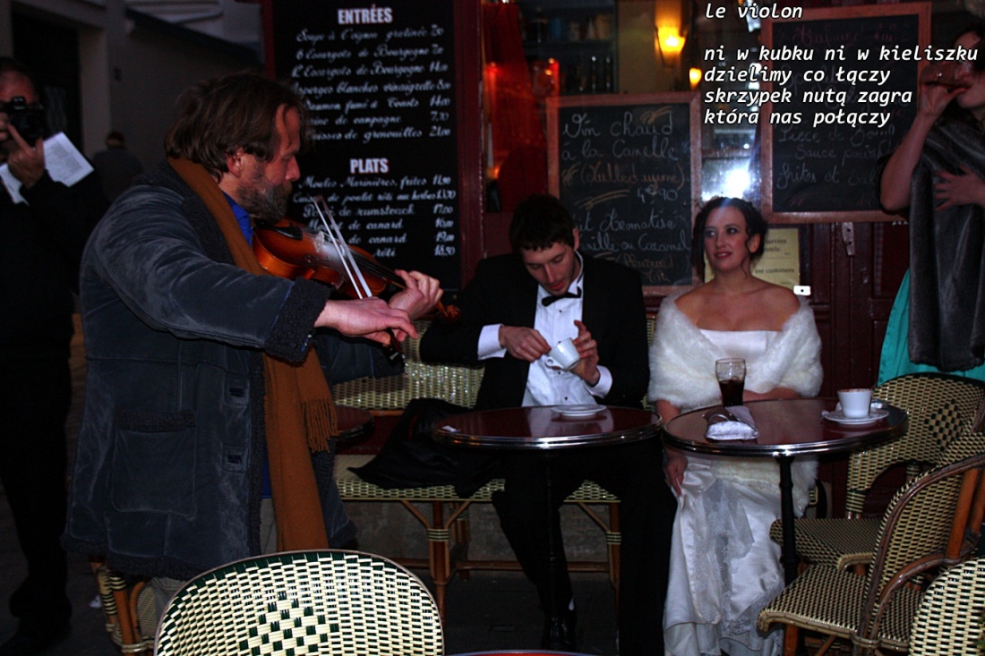 było bardzo zimno tego wieczoru. Widać po szaliku skrzypka. Młodzi gorącem ślubu wiele nie potrzebują oprócz siebie :)