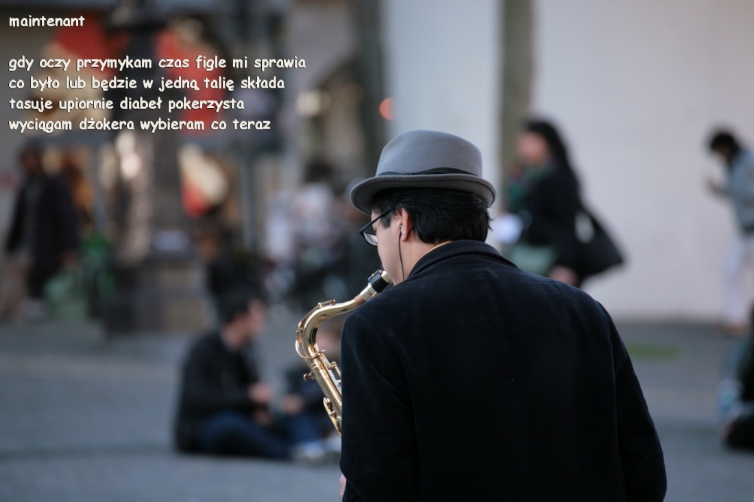 super pocztówka- tekst ładnie wpasowany w fotografię, ciemny kolor ubioru saksofonisty, w tle ciemne postacie, wszystko intrygujące i treść...