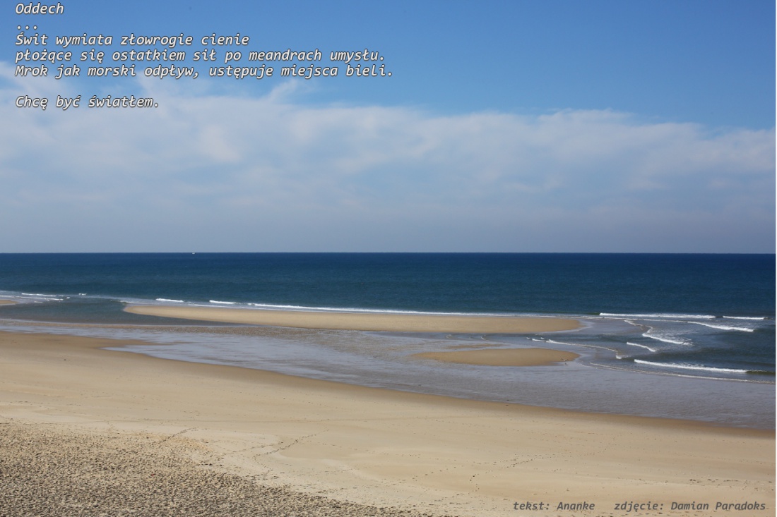 biegnę we śnie białą plażą/ stopy liże morska piana/ w dali błękit w myślach życie/ noc odchodzi świt dogania/ oddal siebie wgłąb milczenia/ podnieść ręce w geście zgody/ wypłyń ze snu w ciszy wspomnień/ w szumie świata w szumie wody/ dziś przeszłości sny odsuwam/ i na szali kładę myśli/ liczę ziarna piasku w dłoniach/ marzę żebyś mi się przyśnił...
