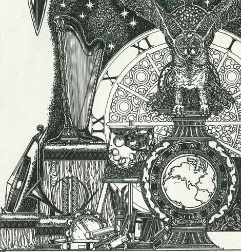 This is a portion of a larger illustration titled "Magnum Opus", first published in 1989 as the centrefold within literary magazine "My Word". It was reprinted 20 years later in e-zine "Urbanwire".