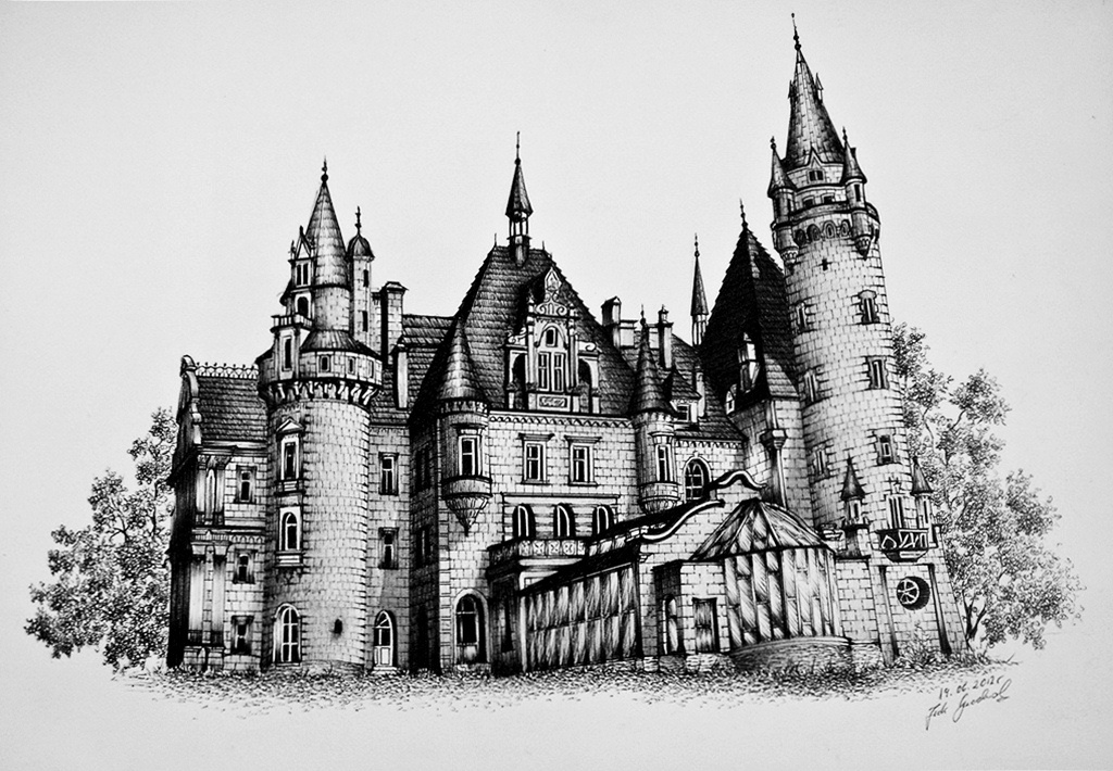 z lewej wieżyczki prawej wieży, tej jednej spośród 99 wież powinna spływać biała lekka szata słynnej białej damy a raczej kości które z niej zostały ;) Chyba że poszła właśnie przejrzeć się w lustrze ;) Swoją drogą niesamowita grafika, jak zwykle :) Czy aby nie jest rysowana ze zdjęcia?