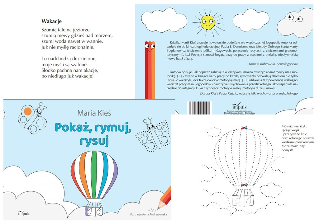 Pokaż ,rymuj, rysuj Rymowanki - rysowanki utrwalają wybrane głoski (np. z pomocą wierszyka "W garderobie"- ćwiczymy głoskę "r"), a przede wszystkim uczą przez zabawę - usprawniają pamięć, myślenie i mowę oraz ćwiczą motorykę dużą i małą. Każdy wierszyk ilustruje nie tylko obrazek, lecz także ruch - w ten sposób młodszy odbiorca lepiej poznaje siebie poprzez wyrażanie własnych emocji i uczy się samokontroli, a dla dorosłych jest to forma czystej zabawy, która rozluźnia i pozwala panować nad oddechem i mową. ISBN: 978-83-66990-19-7 wydawca: Impuls rok: 2021 sklep internetowy: https://paidalogos.wordpress.com/logopeda-online/moje-publikacje/ |