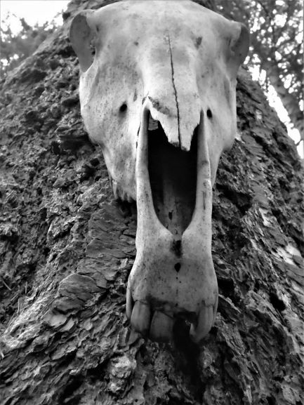 A horse skull on a tree trunk in my back yard....