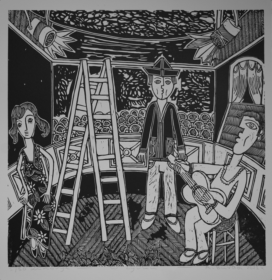 W cyrku. Linoryt. 50 x 50 cm. 2021 r.