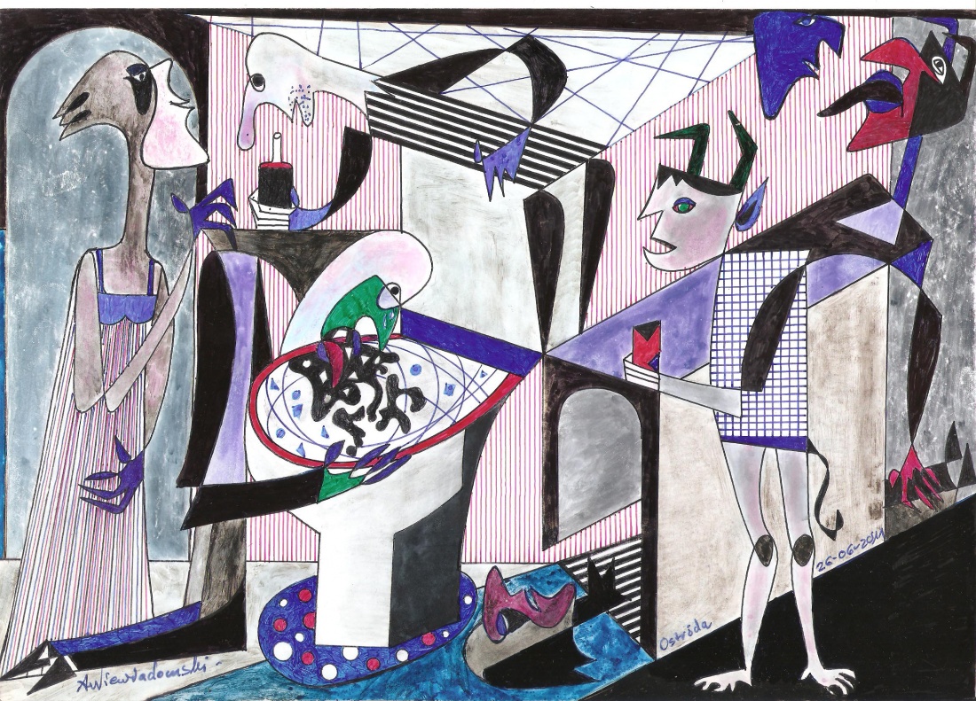 Klasyczny haft Mundka, po imprezie u CYGANA przy asocjacji żony Dzidki, diablików od Belzebuba i sztywnego Fredka ( ten siny, który leży przy muszli klozetowej )