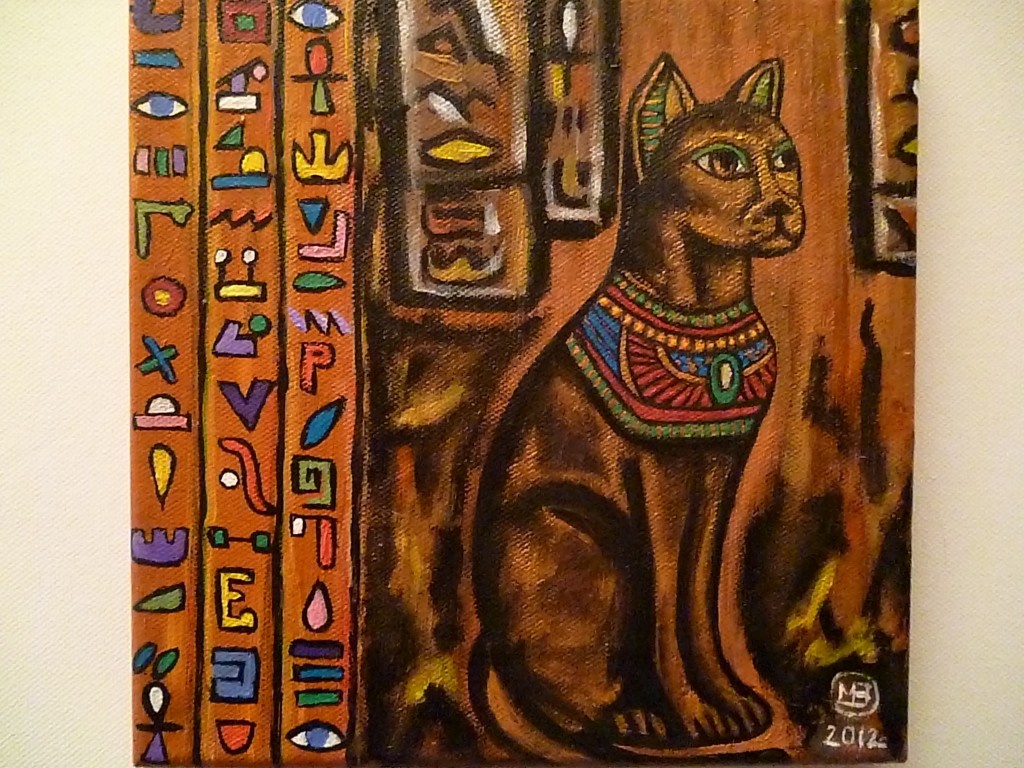 egipski miau-2012:)wys-20cm a szer-20cm:)(inspiracja;z foto z rzezby):)(napisy na pomaranczowym tle;kompozycja wlasna):)