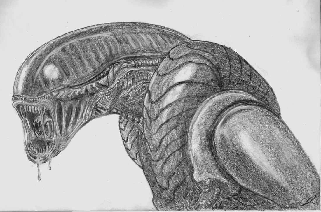 na podstawie projektów autorstwa H.R.Giger'a (wprawka rysunkowa, ołówki, brystol)