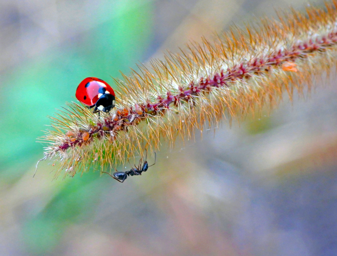 Tu była jedna mrówka i jedna biedronka :)) Biedronka niewiele się ruszała, a mrówka cały czas i atakowała przeciwniczkę. W tym ujęciu zbierała się do ataku :)) Tak, to częsta sytuacja, gdyż mrówki bronią "pogłowia" mszyc, które dają im ulubioną spadź, ale w starciu jedna na jedną widziałam po raz pierwszy :)) Mszyc na źdźble suchej trawy nie widziałam, jeśli już, to ich jajeczka. Może tych też bronią ? Poza tym to koniec września a mszyce i biedronki, jak wiosną.