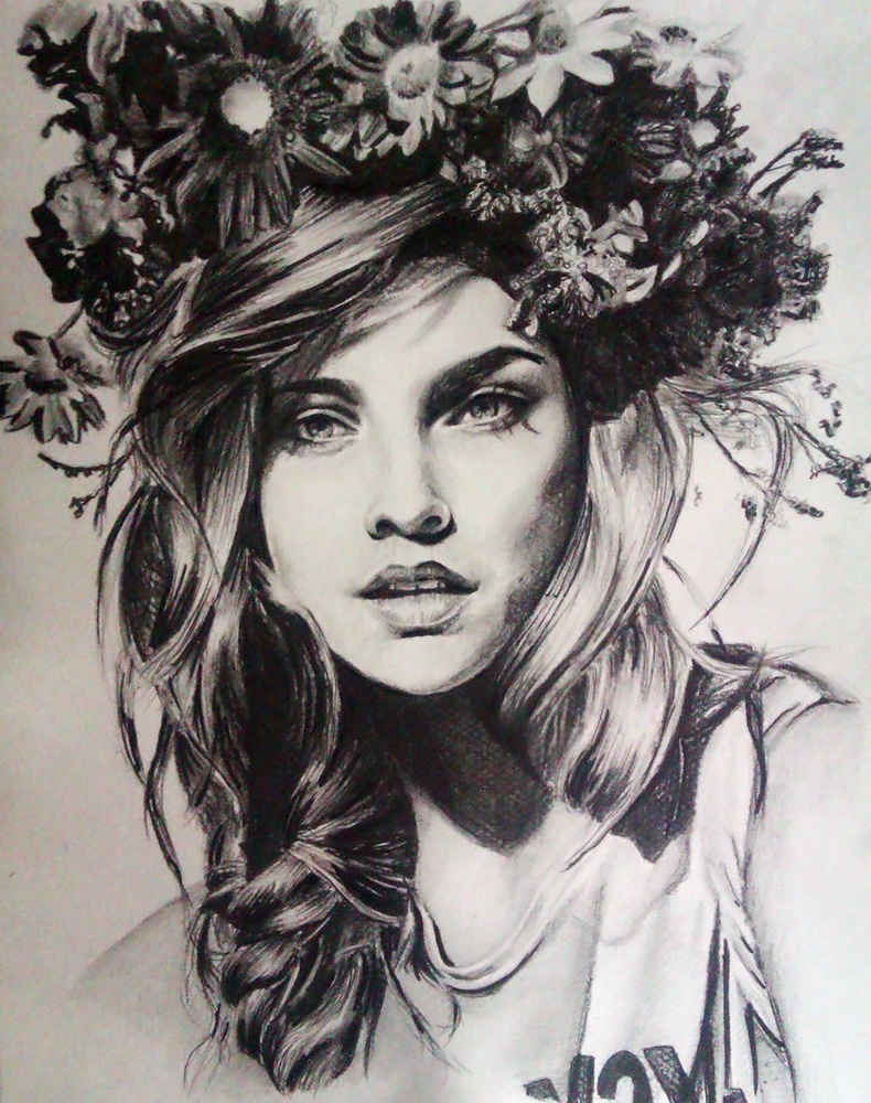 Jestem pod wrażeniem niektórych szczegółów. Kwiat, w centralnej części, idealnie nad czołem. Pięknie zaznaczony w odpowiednim kontraście, jak na fotografii. Przez to odczuwam niedosyt reszty, czym dalej w lewo tym gorzej. Po formie tejże części rysunku mam wrażenie, że bezwzględnie odzwierciedlać miało obraz ze zdjęcia/plakatu. Wracam do kwiatów. Jednak czym dalej w lewo, tym mniej szczegółów, dało to efekt kierowanej ostrości w centralną część obrazu. Świetnie. Gdy pójdę w prawo, dostrzegam wysoki kontrast, co komponuje się z ogólnym światłem, szczególnie widać to dzięki twarzy. Kwiaty przykuwają oko, sama postać to dodatek. Gdyby zamiast podkoszulki widniały zaakcentowane nagie barki, lub też suknia, wprowadziłoby to moim zdaniem ciekawszą historię. Szkic jak dla mnie profesjonalny. Nie wiem czy coś wnoszę swoim komentarzem widząc tak doskonale wykonane szkice, ale być może zauważam coś co ominęłaś. Pozdrawiam serdecznie.