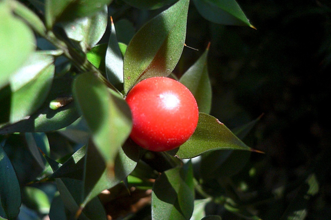 Ruscus aculeatus - Petit-houx - Myszopłoch kolczasty - Kneeholy. Listki myszopłocha kolczastego są wielkości paznokcia i kłują jak u ostrokrzewu. Krzew zachowuje małe jagody czerwone do końca stycznia (ujęte w parku Montsouris w Paryżu).