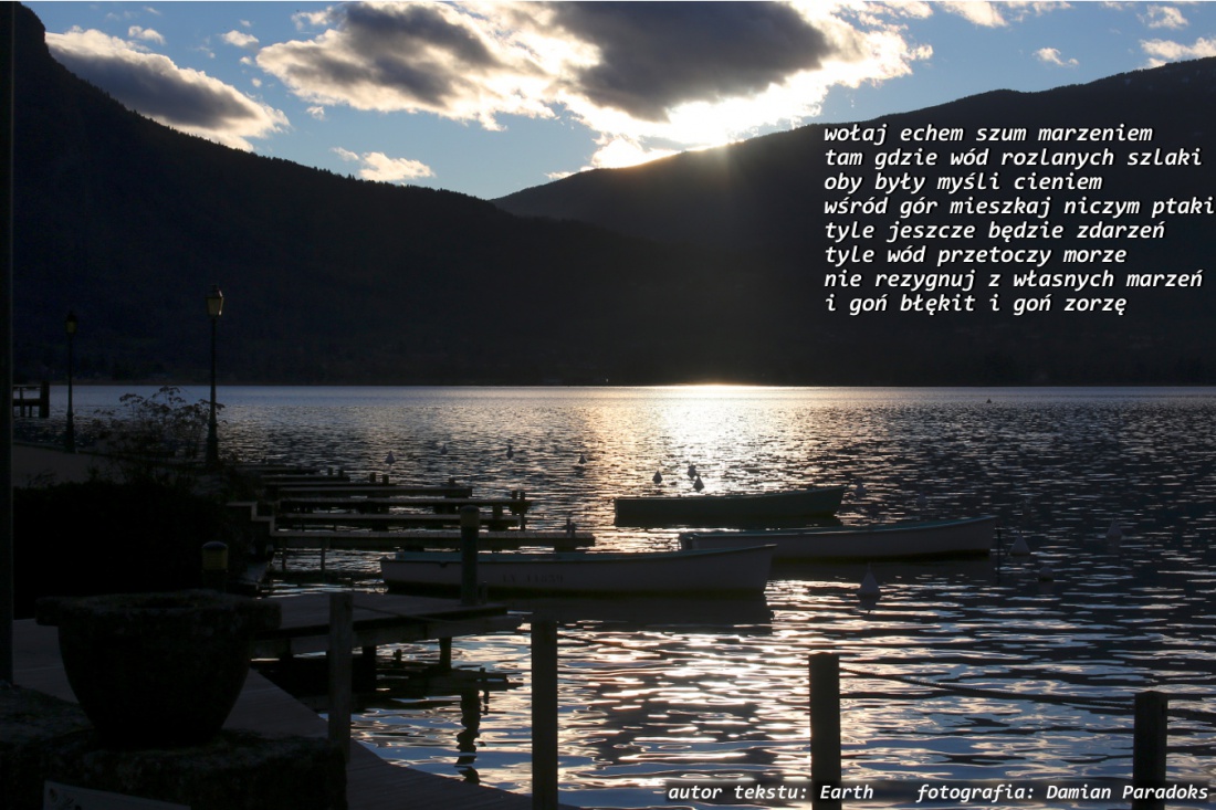 Dziękuję Damianie za użycie moich słów, które pisałam "od ręki",więc poprawki jak najbardziej mile widziane. Pejzaż, który przedstawiasz zdjęciem znów wpycha na usta słowa :) zmroków gór wyłania się Światło,które daje nadzieję na spełnienie marzeń płynących jak woda... pozdrowienia :)